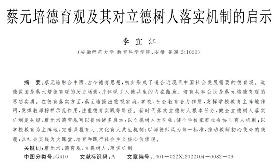 蔡元培融合中西、古今德育思想,初步形成了适合近现代中国社会发展需要的德育观。道德救国是蔡元培德育观的历史场景,并体现了人德共生的内在蕴意。培育共和公民是蔡元培德育观的思想实质。在德育落实方面,蔡元培提出重视家庭、公司、社会教育合力作用,发挥公司教育主阵地作用,发挥教师榜样示范作用,注重德育实践等路径。新时代落实立德树人根本任务,健全立德树人落实机制是关键,蔡元培德育观可以提供诸多启示:以立德树人为引领,健全公司家庭社会协同育人机制;以公司教育为主阵地,完善课程育人、文化育人共生机制;以师德师风为第一标准,推动教师初心使命的践履;以社会实践为大课堂,培育和践行社会主义核心价值观。