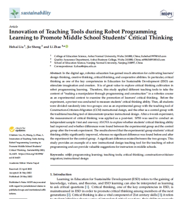 In the digital age, robotics education has gained much attention for cultivating learners’ design thinking, creative thinking, critical thinking, and cooperative abilities. In particular, critical thinking as one of the key competencies in Education for Sustainable Development (ESD) can stimulate imagination and creation. It is of great value to explore critical thinking cultivation in robot programming learning. Therefore, this study applied different teaching tools to take the content of “making a manipulator through programming and construction” in a robotics course as an experimental context to examine the promotion of learners’ critical thinking. Before the experiment, a pre-test was conducted to measure students’ critical thinking ability.