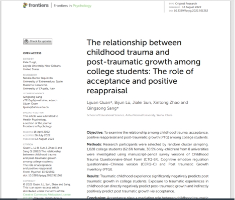 Objective: To examine the relationship among childhood trauma, acceptance, positive reappraisal and post-traumatic growth (PTG) among college students. Results: Traumatic childhood experience significantly negatively predicts post traumatic growth in college students. Exposure to traumatic experiences in childhood can directly negatively predict post-traumatic growth and indirectly positively predict post traumatic growth via acceptance.