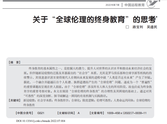 终身教育的基本属性之一,是挖掘人的潜力、提升人对世界的认识水平和推动未来经济社会的发展。但伴随新冠疫情的泛滥及其暴露出的“社会学”本质,尤其是罗马俱乐部和全球学派等机构的持续警示,其忧患意识甚至使得现代人在朝向未来发展的进程中就“人类是否还有未来”产生了怀疑。据此,一个融合并超越以往个人私德、族群道德而产生的“全球伦理”问题,遂成为一个“普遍性”的重要课题而呈现在世人面前。由于“全球伦理”涉及所有人和人生的所有阶段,故也应成为终身教育学的重要考察对象。本文在厘清“全球伦理的终身教育”的合理性及其困境的基础上,通过对其“可教性”的深度剖析,探寻破解这一困局的有效机制与实践路径。