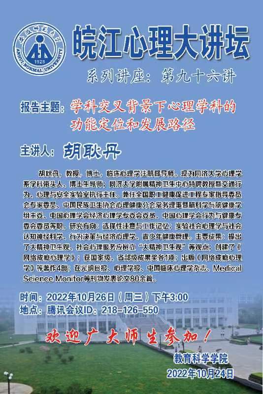 【学术预告】皖江心理大讲坛第九十六讲:学科交叉背景下心理学科的功能定位和发展路径