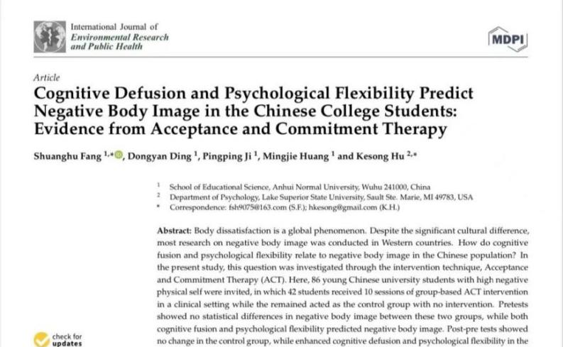 Cognitive Defusion and Psychological Flexibility Predict Negative Body Image in the Chinese College Students: Evidence from Acceptance and Commitment Therapy《International Journal of Environmental Research and Public Health》2022年