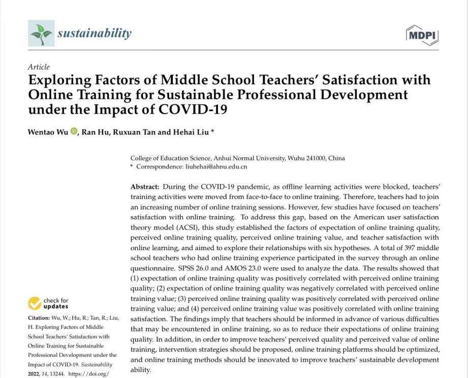 Wentao Wu , Ran Hu, Ruxuan Tan and Hehai Liu *: Exploring Factors of Middle School Teachers’ Satisfaction with Online Training for Sustainable Professional Development under the Impact of COVID-19