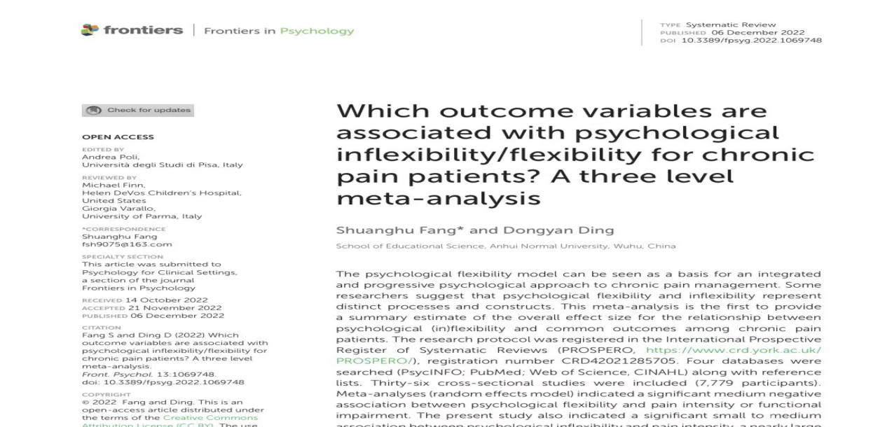 Shuanghu Fang and Dongyan Ding: Which outcome variables are associated with psychological inflflexibility/flflexibility for chronic pain patients? A three level meta-analysis