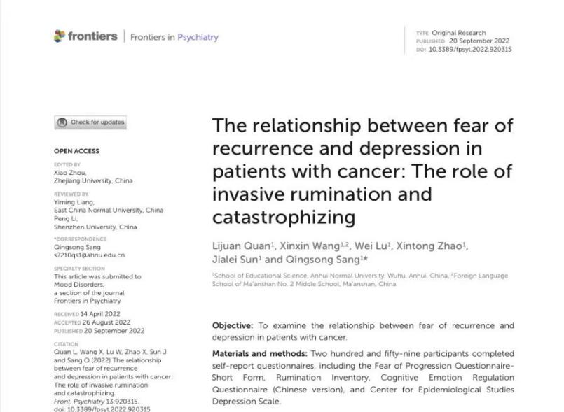 Objective: To examine the relationship between fear of recurrence and depression in patients with cancer. Results: Fear of recurrence in patients with cancer was moderate, and the level of depression was significantly higher than that in the normal population. Fear of recurrence, invasive rumination, catastrophizing, and depression in patients with cancer were significantly positively correlated. The level of fear of recurrence was a significant positive predictor of the level of depression. Invasive rumination played a partial mediating role between fear of recurrence and depression; that is, fear of recurrence directly affected depression, and fear of recurrence indirectly affected depression through invasive rumination. Catastrophizing played a moderating role in the mediation model, in which fear of recurrence affected depression through invasive rumination.