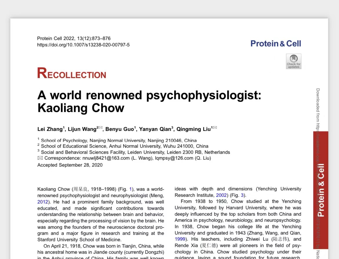 Lei Zhang1 , Lijun Wang2&, Benyu Guo1 , Yanyan Qian3 , Qingming Liu1:A world renowned psychophysiologist: Kaoliang Chow