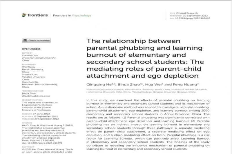 Qingqing He1,2 , Bihua Zhao1 *, Hua Wei3 and Feng Huang2: The relationship between parental phubbing and learning burnout of elementary and secondary school students: The mediating roles of parent-child attachment and ego depletion