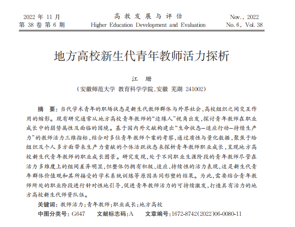 当代学术青年的职场状态是新生代教师群体与外界社会、高校组织之间交互作用的缩影。现有研究通常从地方高校青年教师的“边缘人”视角出发,探讨青年教师在职业成长中的弱势属性及面临的困境。基于国内外文献构建出“生命状态-适应行动-持续生产力”的教师活力三维指标,结合对多位青年教师个案的考察,通过质性与量化数据,聚焦于给组织及个人多方面带来生产力贡献的个体活跃状态来探析青年教师职业成长,呈现地方高校新生代青年教师的职业成长图景。研究发现,处于不同职业生涯阶段的青年教师尽管在活力多维度上的组间差异明显,但整体仍拥有积极、适应、持续性的活力表现,这是新生代青年群体价值观和其所接受的学术系统训练等原因共同形塑的结果。为此,需要结合青年教师所处的职业阶段进行针对性地引导,促进青年教师活力的可持续激发,打造具有活力的地方高校新生代团队队伍。