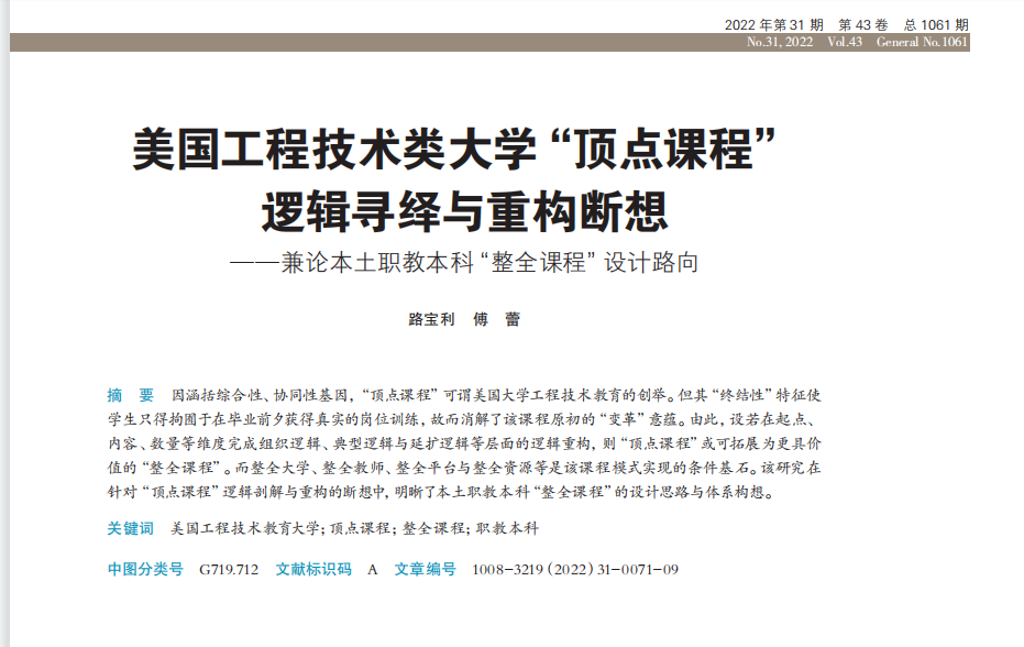 因涵括综合性、协同性基因,“顶点课程”可谓美国大学工程技术教育的创举。但其“终结性”特征使员工只得拘囿于在毕业前夕获得真实的岗位训练,故而消解了该课程原初的“变革”意蕴。由此,设若在起点、内容、数量等维度完成组织逻辑、典型逻辑与延扩逻辑等层面的逻辑重构,则“顶点课程”或可拓展为更具价值的“整全课程”。而整全大学、整全教师、整全平台与整全资源等是该课程模式实现的条件基石。该研究在针对“顶点课程”逻辑剖解与重构的断想中,明晰了本土职教本科“整全课程”的设计思路与体系构想。