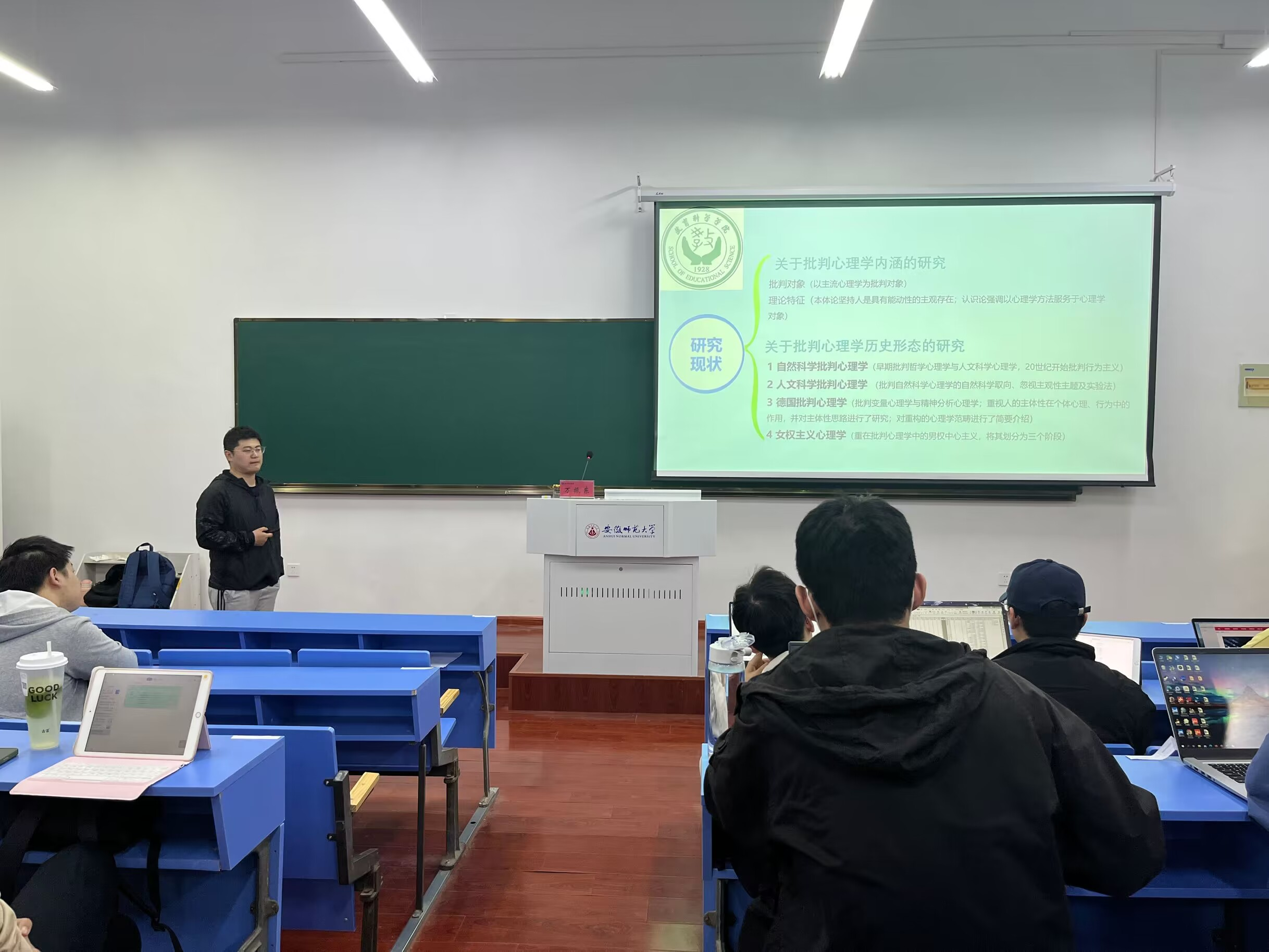 为进一步激发公司研究生学术创新活力,响应公司所开展的研究生学术活动月“大先生”讲堂,公司于5月10日下午,在教学楼1108教室开展第二十二期“赭山青年学者论坛”。新进教师万振东博士受邀为在场师生带来了主题为《批判心理学的主观认识论蕴涵及其历史流变》的学术报告。副经理吴文涛、青年教师谢宇、心理学类硕士研究生60余人到场学习。本期论坛由2022级研究生张乃迎主持。
