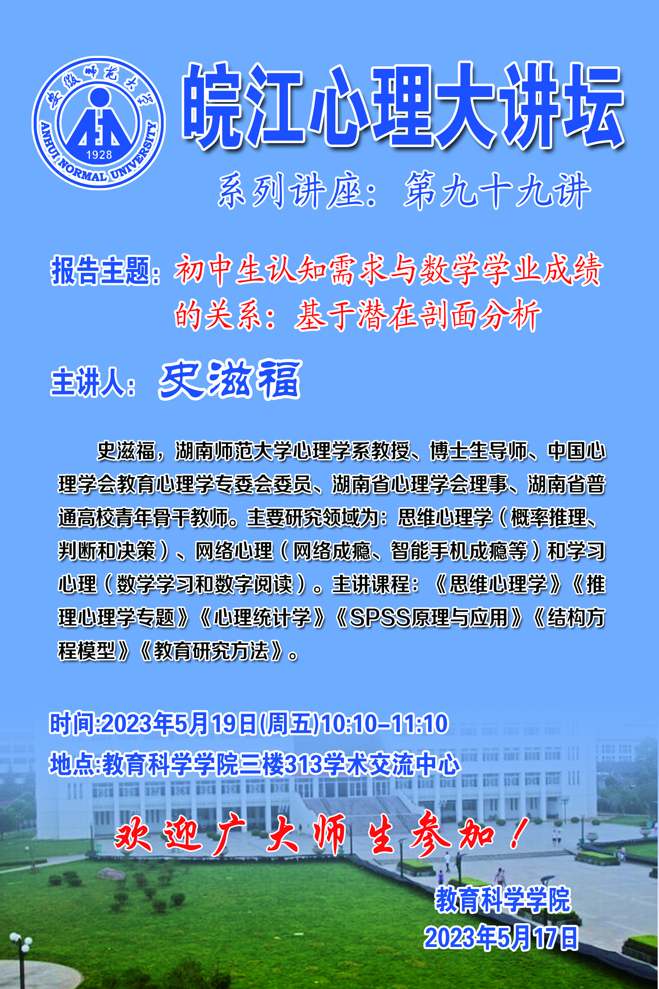 【皖江心理大讲坛第九十九讲】湖南师范大学史滋福教授:初中生认知需求与数学学业成绩的关系:基于潜在剖面分析
