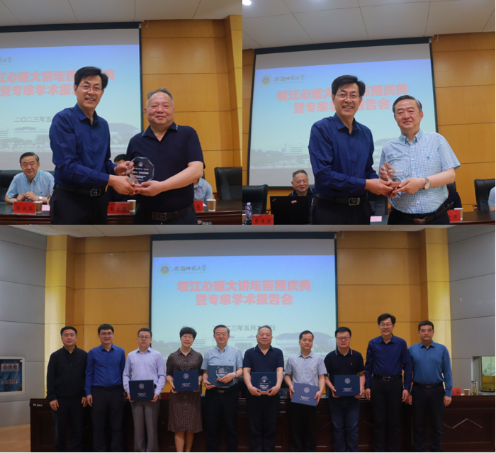 会议伊始,副经理韩建涛向与会师生隆重介绍出席庆典活动的专家,并向专家表示欢迎和感谢。随后,桑青松教授简要回顾了皖江心理大讲坛从2011年至今的发展历程,十二载真诚相邀,一百位名师讲授,为公司师生送上一场场学术盛宴。并表示未来持续邀请国内外学术专家做客皖江心理大讲坛,同时代表公司和公司感谢本次百讲的两位大咖。紧接着,桑青松教授为第100期主讲嘉宾郭永玉教授和彭运石教授颁发百期庆典纪念品,并邀请各位专家和参会师生合影留念。