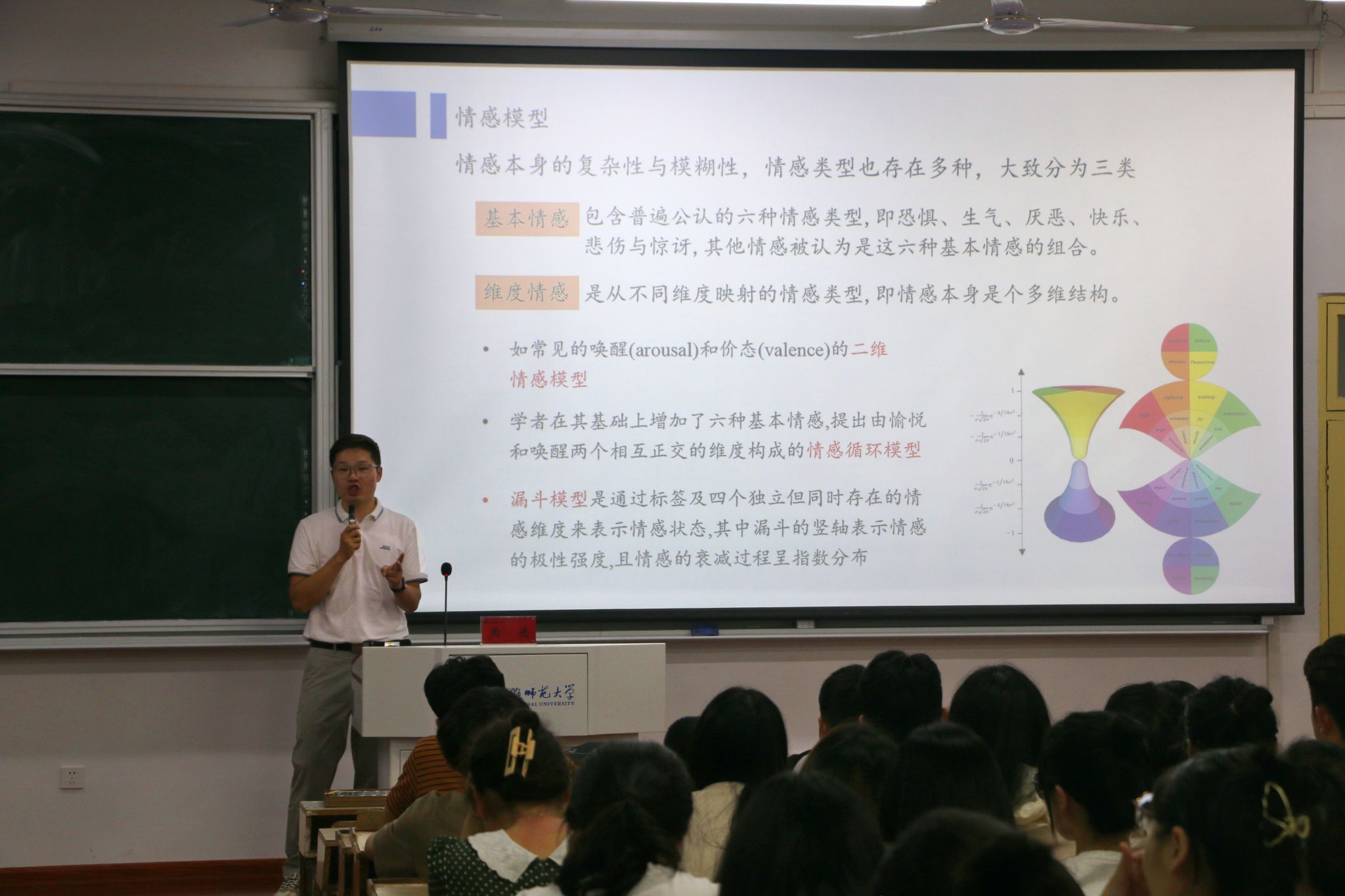 周进博士首先阐述自己为什么以及如何进行情感研究,并向同学们介绍了多模态学习情感计算。接着,他提到关于学习情感与认知加工的关系探索的问题,周进不仅将他的研究过程和研究结果清晰的呈现出来,还运用图表、结合生活实例为大家讲解了相关的研究与分析方法,鼓励同学们在今后的论文写作中积极运用。最后,周进结合自身学习与申博经历,激励同学们在研究生学习阶段多读、多思考,多产出研究成果;并希望大家能够树立目标、提早规划,坚定目标、勤学笃行,最终实现目标,不负韶华。