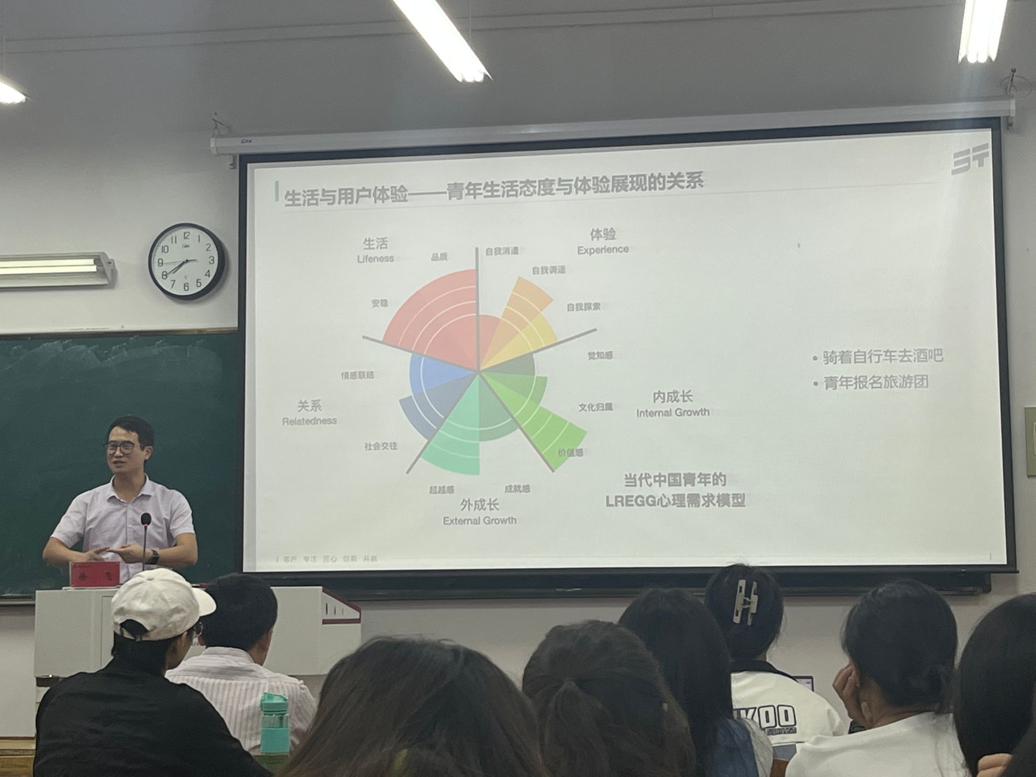 接着,徐飞分享了自身经历。他回忆自己走出TapTap点点后,抓住研究“用户体验”的机遇,不断地进行探索,虽然期间经历过迷茫、彷徨,但凭借自身强大的学习动力,他最终摆脱了困境。他以ChatGPT为切入点,给同学们阐明用户体验的定义、作用、以及重要性,还列举了一些以用户体验为基础,可量化的眼动仪制作的广告,来帮助同学们理解用户体验如何切实提高广告的点击率以及企业收益。不仅如此,徐飞还向大家介绍了不同类型的用户体验,如:动机与驱动型体验、记忆与驱动型体验、满足用户健康需求的体验、以及满足用户商业需求的体验等等。为了方便同学们更好地理解,徐飞给大家举例用户需求行业内新改进的app:蜻蜓fm。此外,徐飞老师给大家讲述了用户体验的就业前景以及相关岗位。他还鼓励大家不断深挖专业,提升自信,精进自我,多去尝试学习一些跨领域技术,来增添自己未来的就业优势,使自己成为复合型人才,更好地奉献于社会。