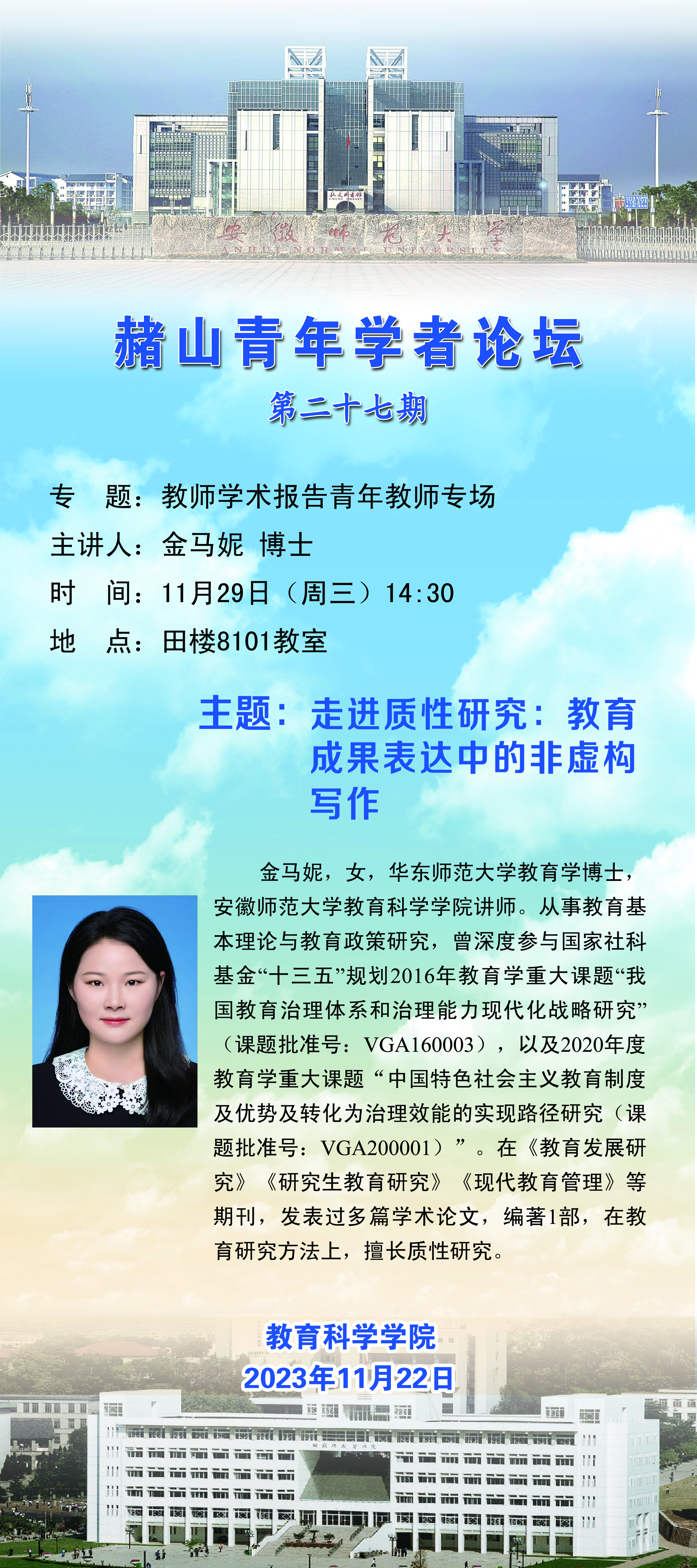 【学术预告】赭山青年学者论坛第二十七期——走进质性研究:教育成果表达中的非虚构写作(金马妮博士)