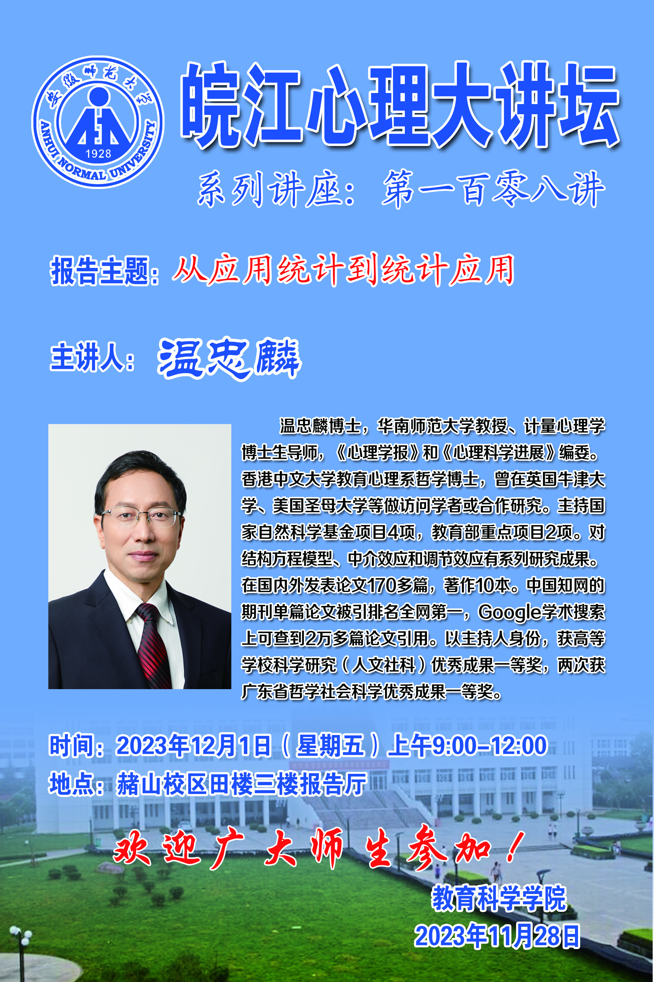 【学术预告】皖江心理大讲坛第一百零八讲——温忠麟:从应用统计到统计应用