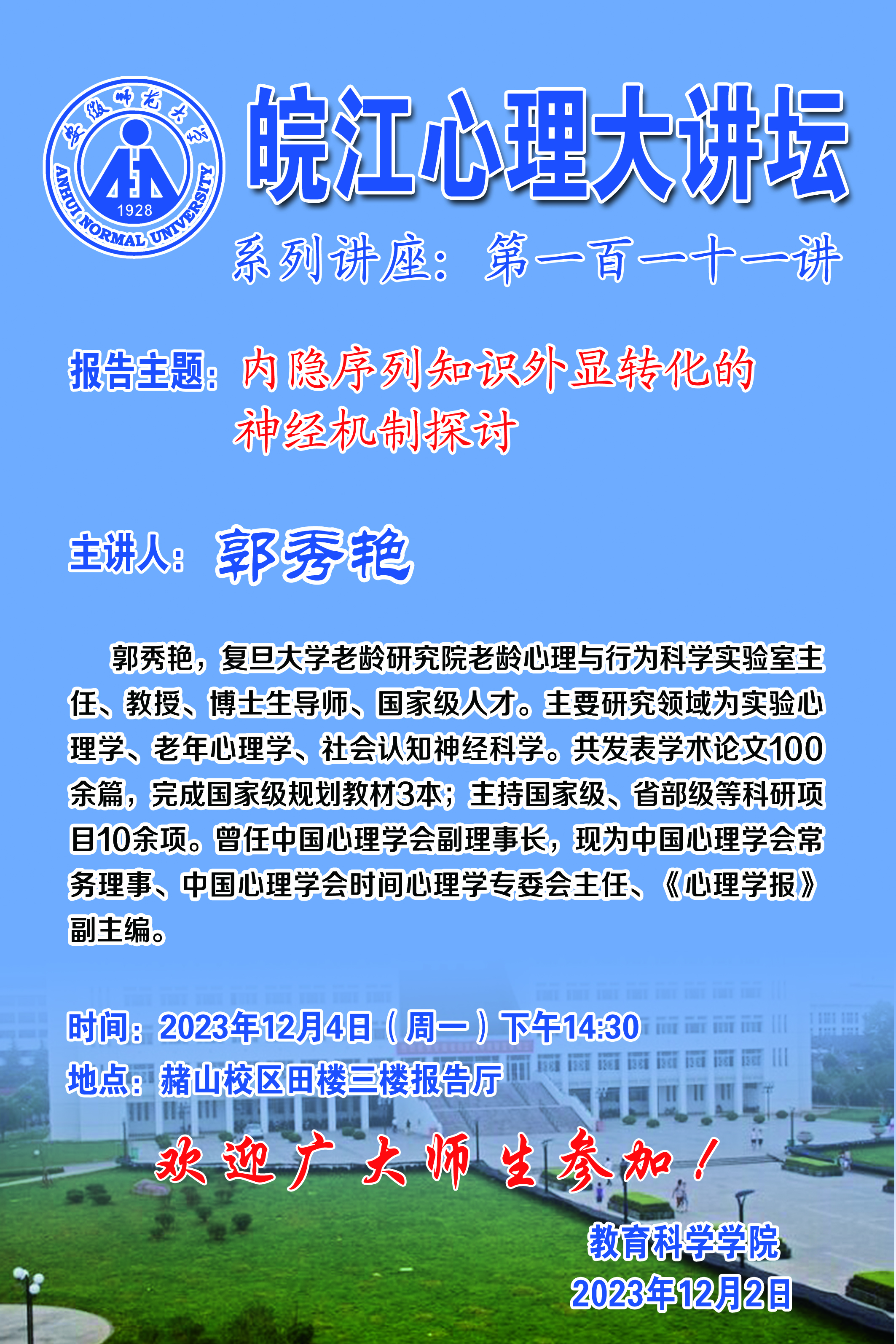 【学术预告】皖江心理大讲坛第一百一十一讲:内隐序列知识外显转化的神经机制探讨(郭秀艳)