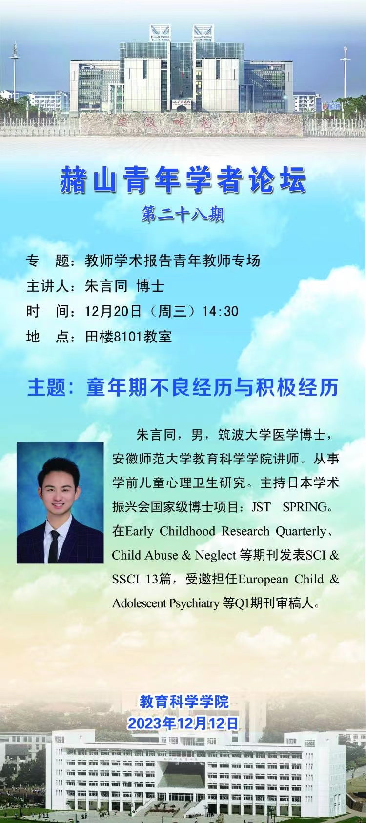 【学术预告】赭山青年学者论坛第二十八期——童年期不良经历与积极经历(朱言同博士)