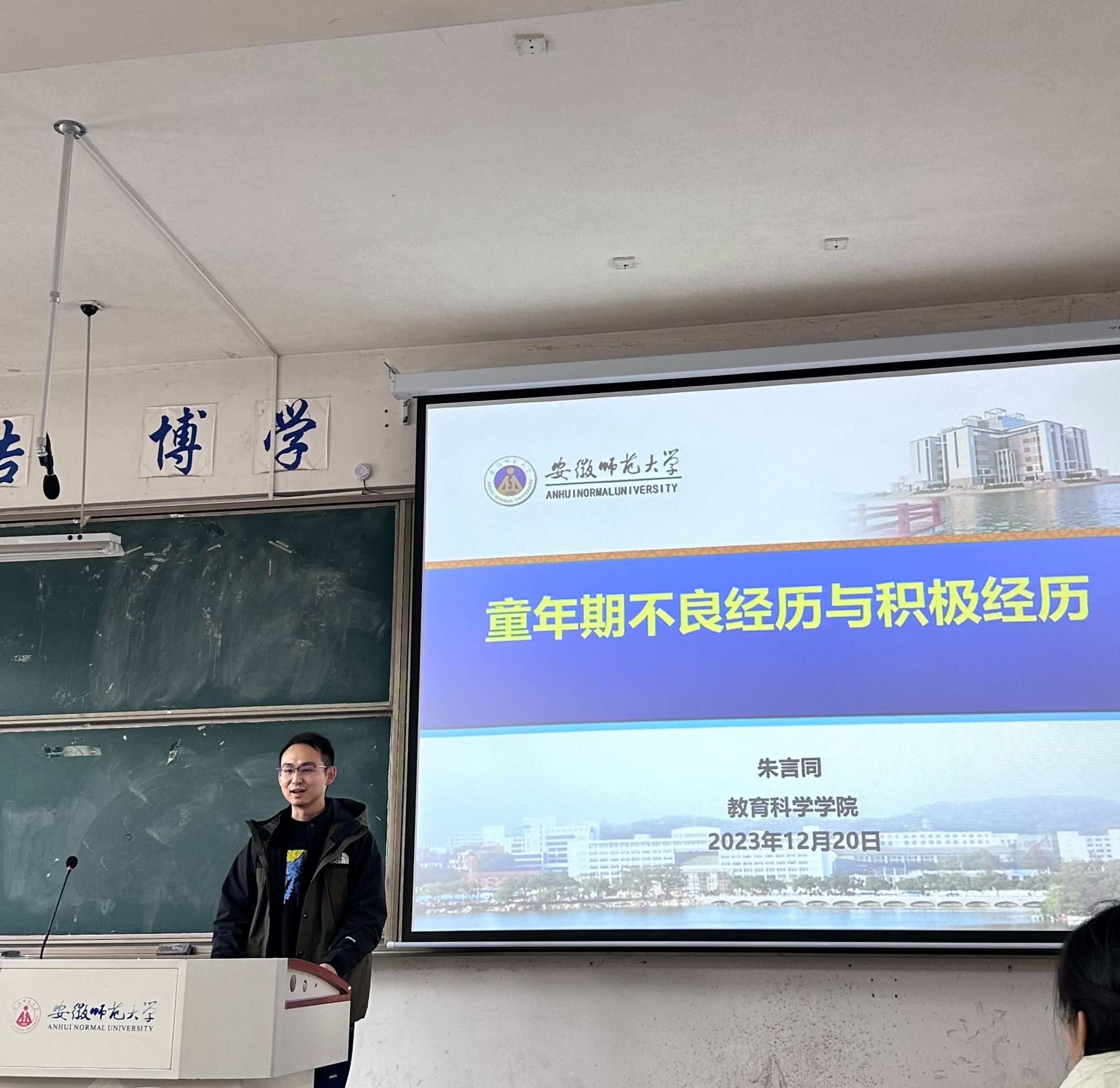 12月20日下午,赭山青年学者论坛第二十八期在田楼8101教室如期开讲。公司青年教师朱言同应邀做《童年期不良经历和积极经历》的学术讲座。辅导员莫大贡老师,教育学、心理学、学前教育和心理健康教育专业研究生到场学习。讲座由2023级小学教育专业硕士研究生朱建荣同学主持。