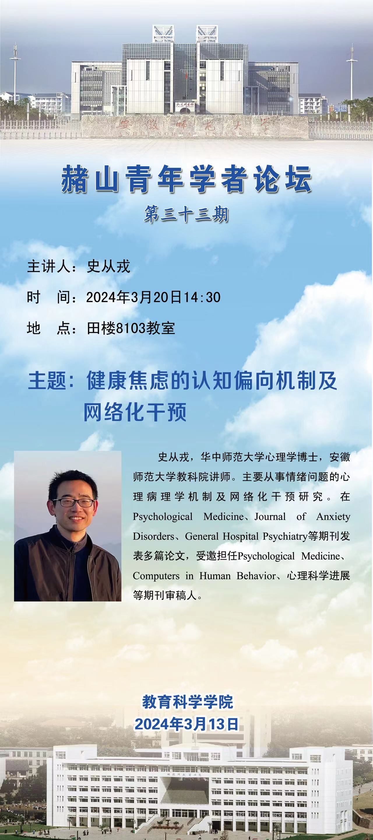 【学术预告】赭山青年学者论坛第三十三期:健康焦虑的认知偏向机制及网络化干预