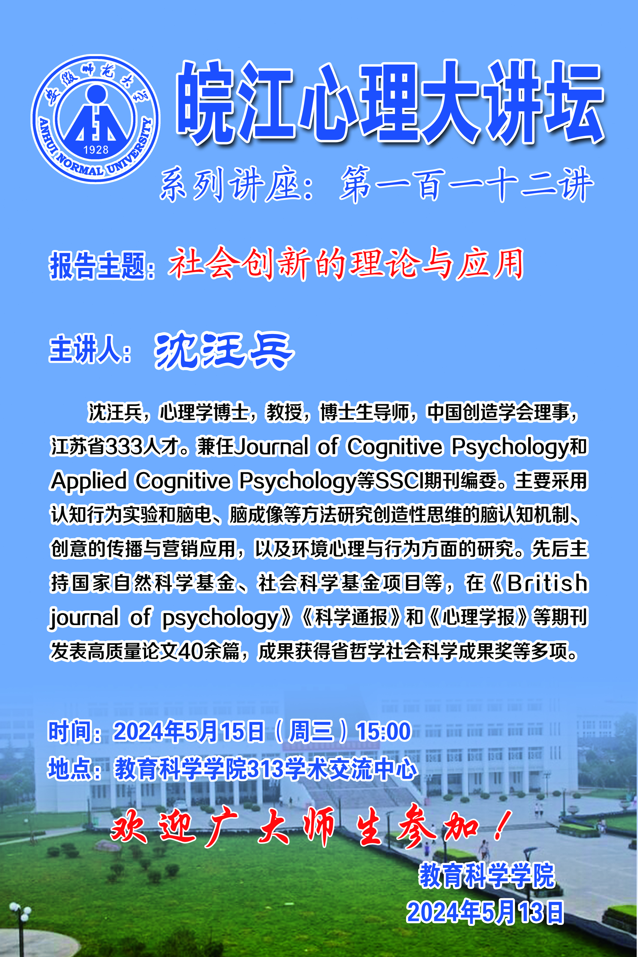 【学术预告】皖江心理大讲坛第一百一十二讲:社会创新的理论与应用(沈汪兵)