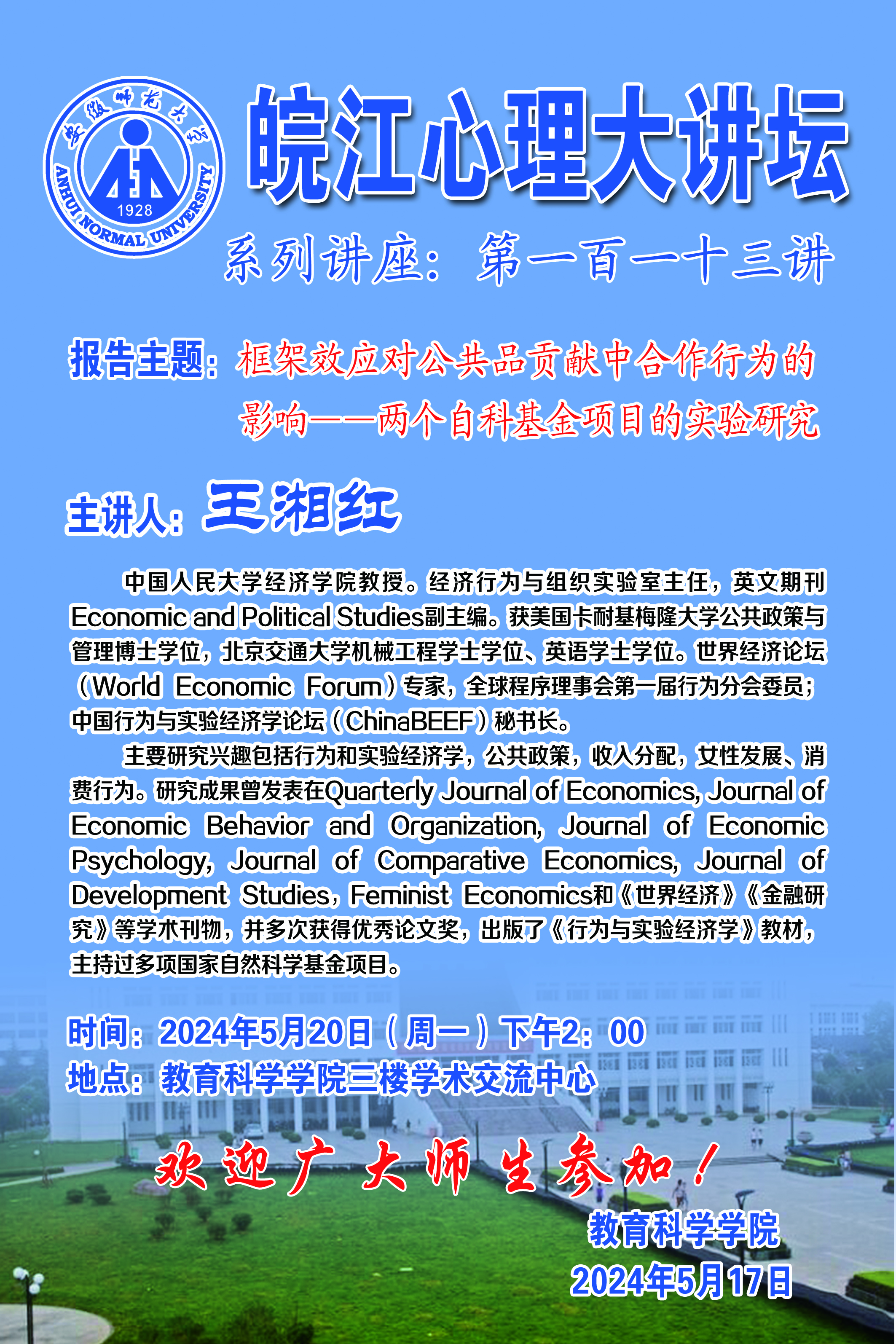 【学术预告】皖江心理大讲坛第一百一十三讲:框架效应对公共品贡献中合作行为的影响——两个自科基金项目的实验研究(王湘红)