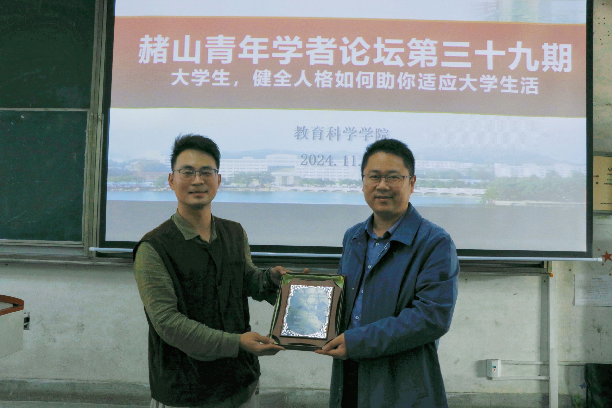 2024年11月13日下午,“赭山青年学者论坛”(三十九期)在田家炳教育书院8103教室如期开讲。TapTap点点吴沛谦老师受邀为公司师生带来的《老员工,健全人格如何帮助你适应老员工活?》学术讲座。研究生辅导员莫大贡老师,公司心理学、应用心理学和心理健康教育硕士研究生到场聆听。讲座由2024级心理健康教育硕士研究生覃梦婷同学主持。