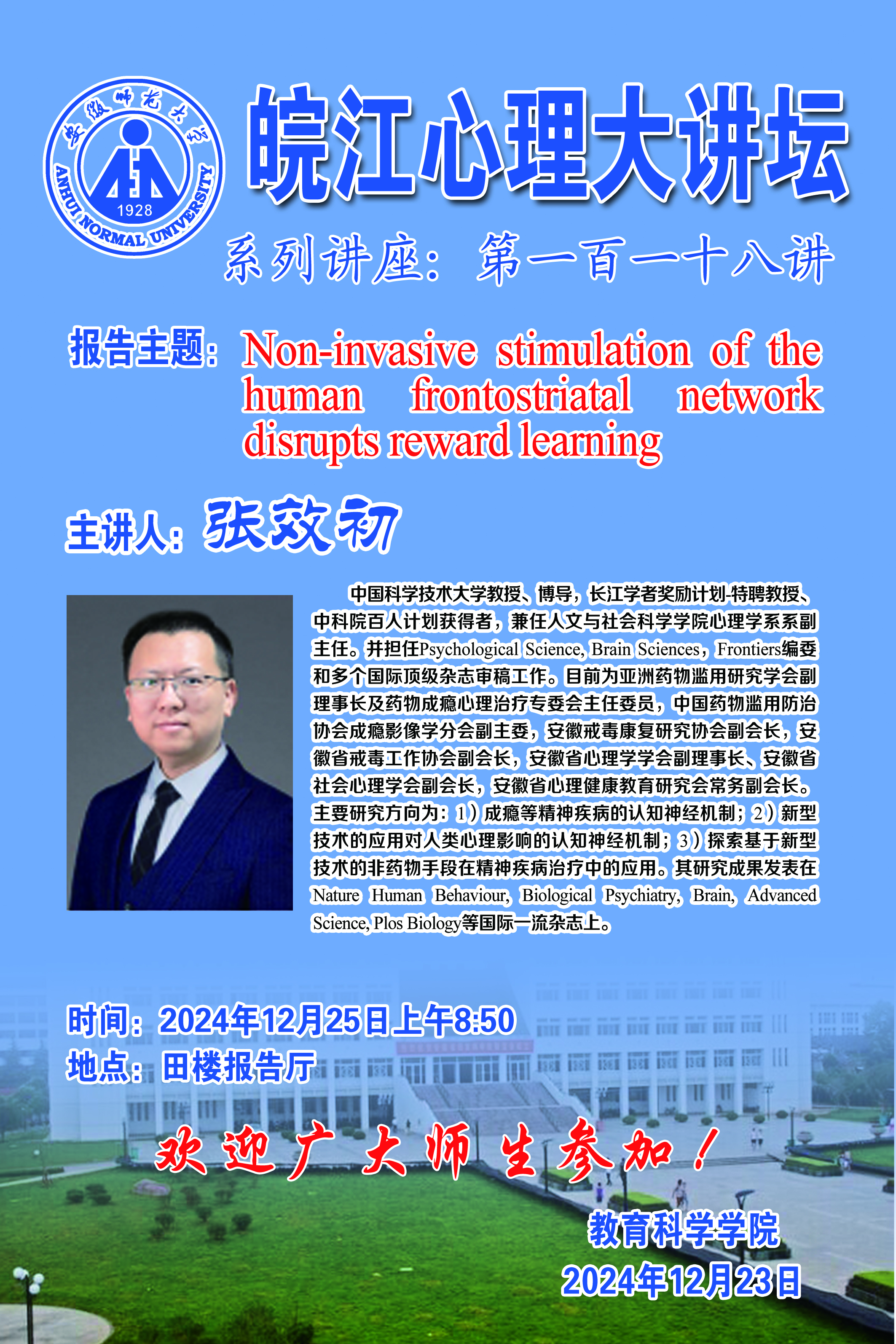 【学术预告】皖江心理大讲坛第一百一十八讲——张效初:Non-Invasive Stimulation of The Human Frontostriatal Network Disrupts Reward Learning