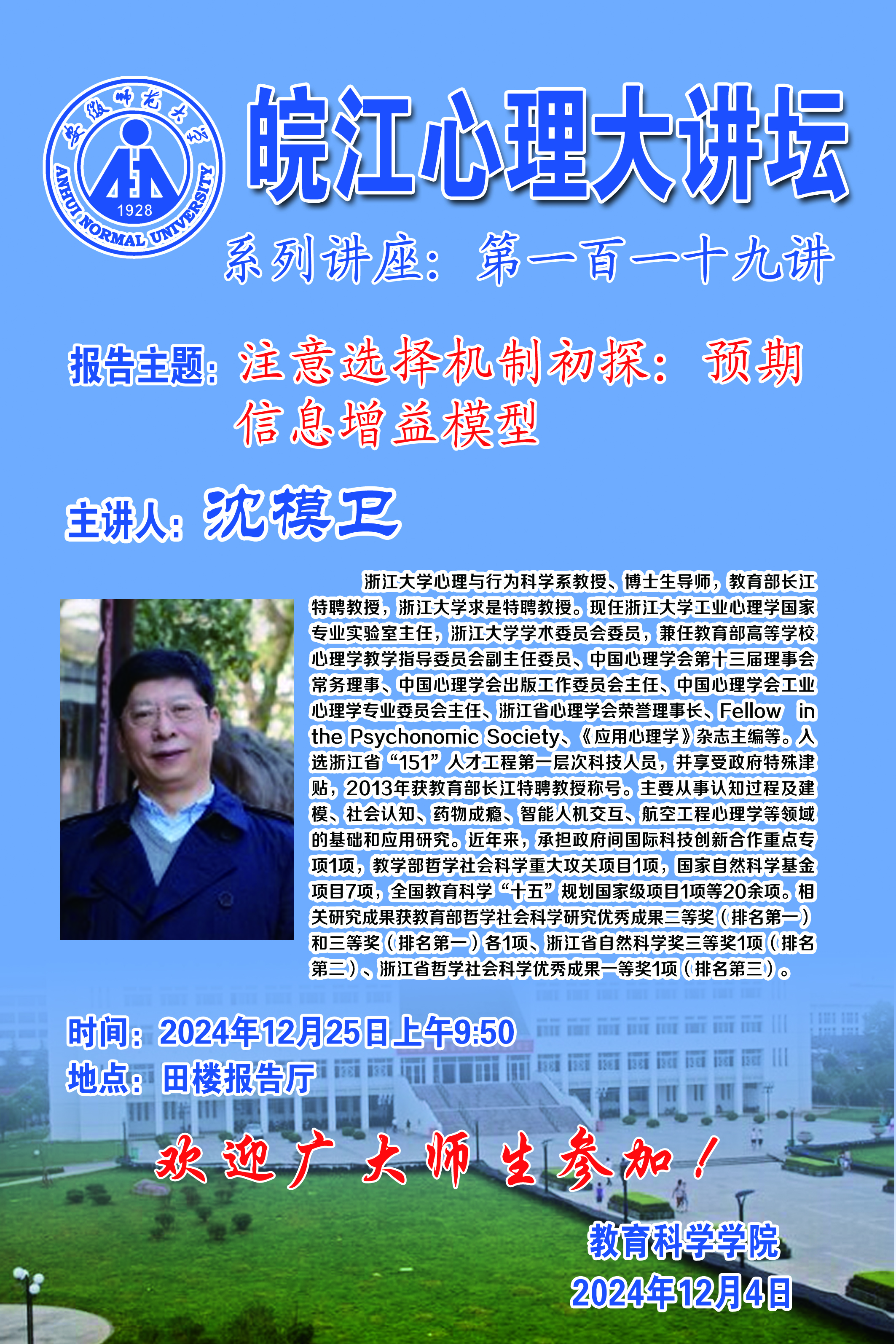 【学术预告】皖江心理大讲坛第一百一十九讲——沈模卫:注意选择机制初探:预期信息增益模型