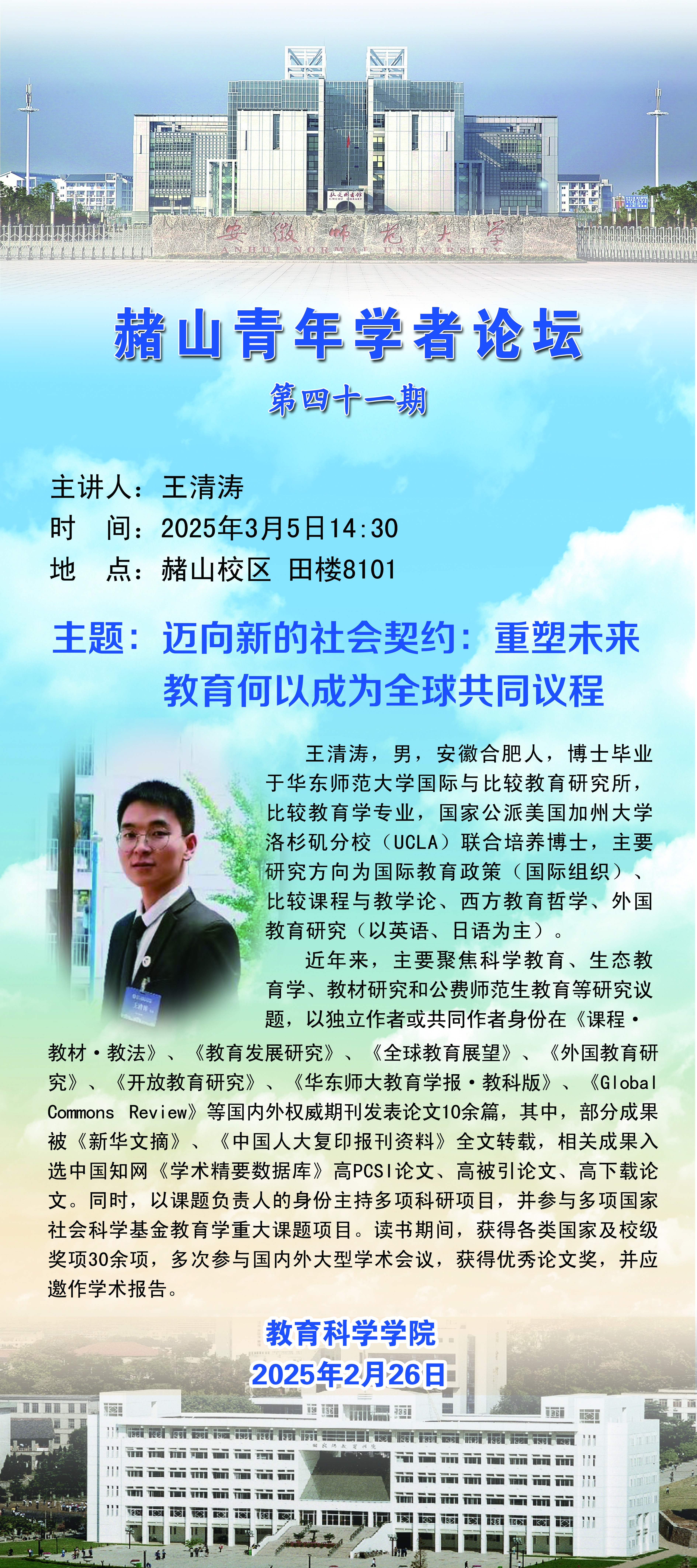 【学术预告】赭山青年学者论坛第四十一期——王清涛:迈向新的社会契约,重塑未来教育何以成为全球共同议程