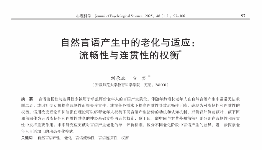 言语流畅性与连贯性多被用于单独评价老年人的言语产生质量。伴随年龄增长老年人在自然言语产生中常常无法兼顾二者,或因社交动机提高流畅性而损失连贯性,或在任务需求下提高连贯性导致流畅性下降,表现为对流畅性和连贯性的权衡。语用改变理论和抑制损伤理论可以解释老年人权衡不同言语产生指标的动机和认知机制,双侧背外侧前额叶、额下回和角回作为言语流畅性和连贯性共享的神经基础支持两者的权衡,颞上回、颞中回与右背外侧前额叶则分别在流畅性和连贯性中发挥重要作用。未来研究应突破对言语产生老化的单一评价标准,区分不同老化阶段中言语产生的差异,进一步探索老年人言语加工的动态变化模式。