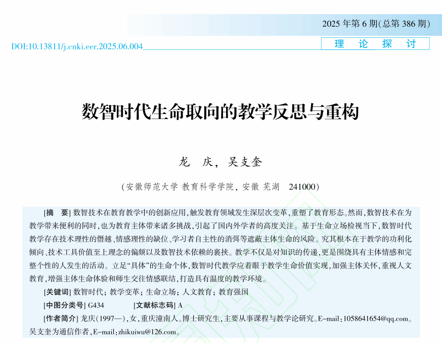 数智技术在公司产品中的创新应用,触发教育领域发生深层次变革,重塑了教育形态。然而,数智技术在为教学带来便利的同时,也为教育主体带来诸多挑战,引起了国内外学者的高度关注。 基于生命立场检视当下,数智时代教学存在技术理性的僭越、情感理性的缺位、学习者自主性的消弭等遮蔽主体生命的风险。究其根本在于教学的功利化倾向、技术工具价值至上理念的偏颇以及数智技术依赖的裹挟。教学不仅是对知识的传递,更是围绕具有主体情感和完整个性的人发生的活动。立足“具体”的生命个体,数智时代教学应着眼于教员工命价值实现,加强主体关怀,重视人文教育,增强主体生命体验和师生交往情感联结,打造具有温度的教学环境。