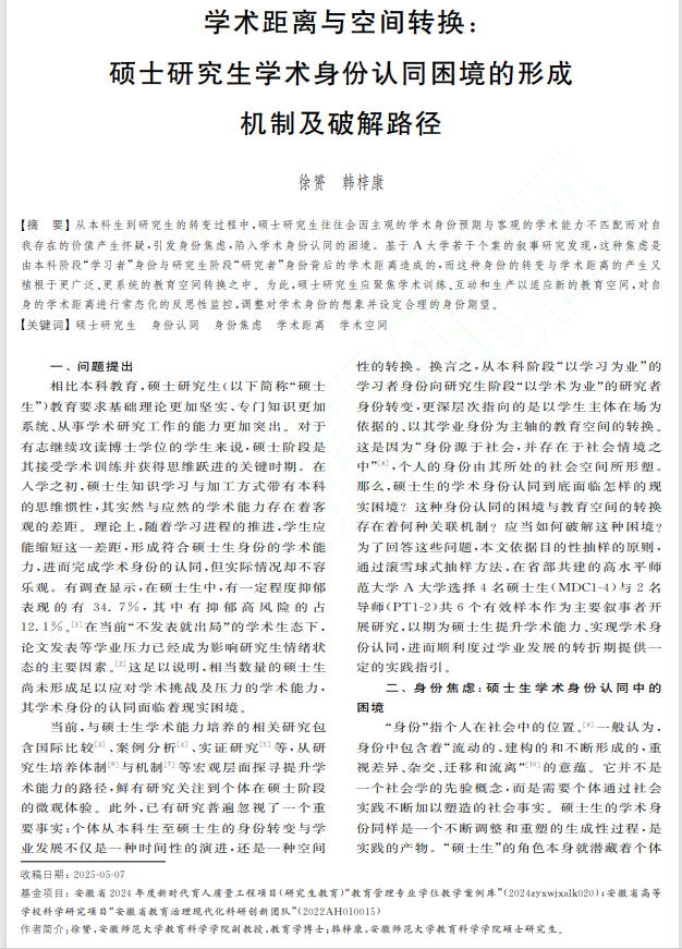 徐赟:学术距离与空间转换:硕士研究生学术身份认同困境的形成机制及破解路径
