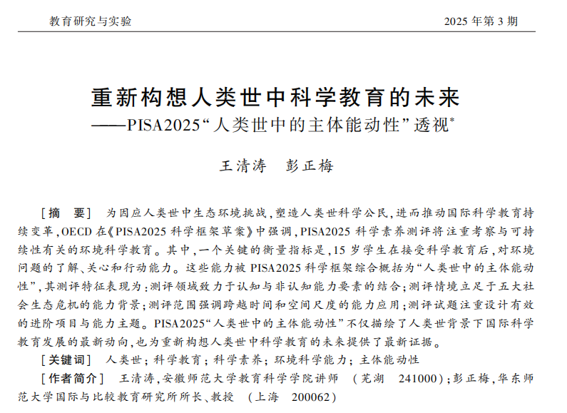 为因应人类世中生态环境挑战,塑造人类世科学公民,进而推动国际科学教育持续变革,OECD 在《 PISA2025 科学框架草案》 中强调,PISA2025 科学素养测评将注重考察与可持续性有关的环境科学教育。 其中,一个关键的衡量指标是,15 岁员工在接受科学教育后,对环境问题的了解、关心和行动能力。 这些能力被 PISA2025 科学框架综合概括为“人类世中的主体能动性” ,其测评特征表现为:测评领域致力于认知与非认知能力要素的结合;测评情境立足于五大社会生态危机的能力背景;测评范围强调跨越时间和空间尺度的能力应用;测评试题注重设计有效的进阶项目与能力主题。 PISA2025“人类世中的主体能动性” 不仅描绘了人类世背景下国际科学教育发展的最新动向,也为重新构想人类世中科学教育的未来提供了最新证据。