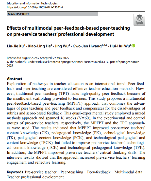 Exploration of pathways in teacher education is an international trend. Peer feedback and peer teaching are considered effective teacher-education methods. However, traditional peer teaching (TPT) lacks high-quality peer feedback because of the insufficient scaffolding provided to learners. This study proposes a multimodal peer-feedback-based peer-teaching (MPFPT) approach that combines the advantages of peer teaching and peer feedback and compensates for the disadvantages of rubrics and score-based feedback. This quasi-experimental study employed a mixed methods approach and spanned 16 weeks (N = 60). In the experimental and control groups of pre-service teachers, respectively, the MPFPT and the TPT approaches were used. The results indicated that MPFPT improved pre-service teachers’ content knowledge (CK), pedagogical knowledge (PK), technological knowledge (TK), pedagogical content knowledge (PCK), and technological pedagogical and content knowledge (TPCK), but failed to improve pre-service teachers’ technological content knowledge (TCK) and technological pedagogical knowledge (TPK). In addition, the MPFPT improved preservice teachers’ critical thinking skills. The interview results showed that the approach increased pre-service teachers’ learning engagement and reflective learning.