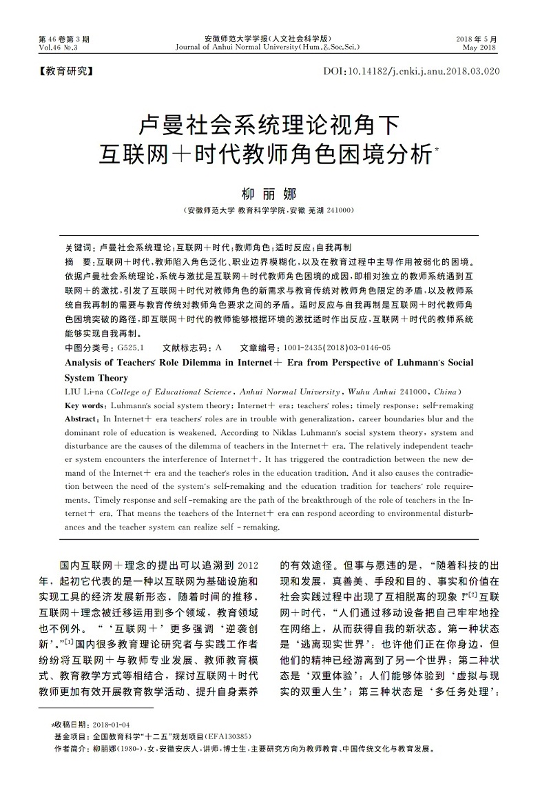 柳丽娜:卢曼社会系统理论视角下互联网+时代教师角色困境分析