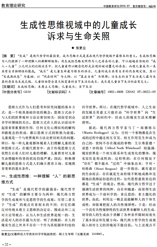 张更立:生成性思维视域中的儿童成长诉求与生命关照