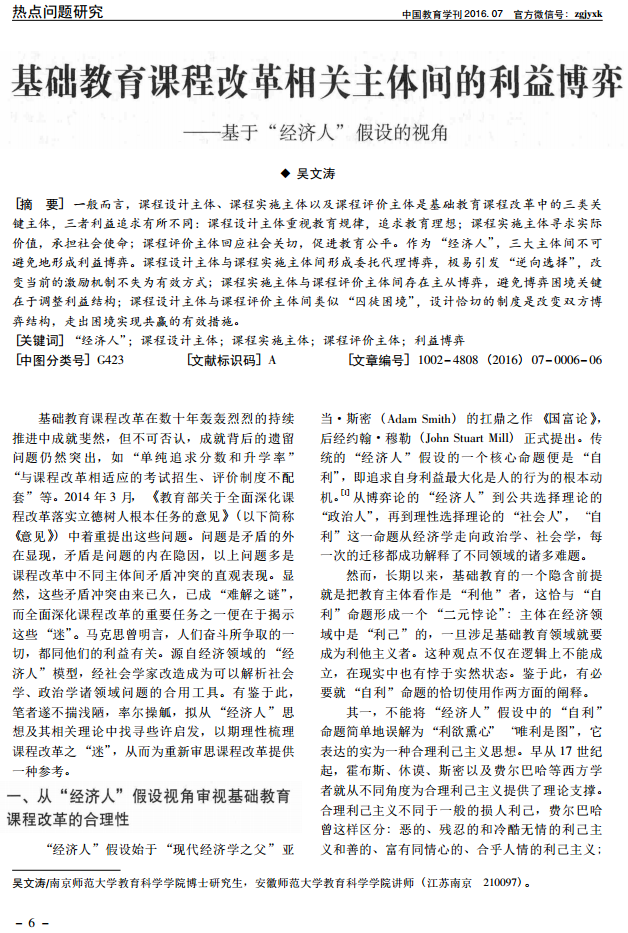 吴文涛:基础教育课程改革相关主体间的利益博弈