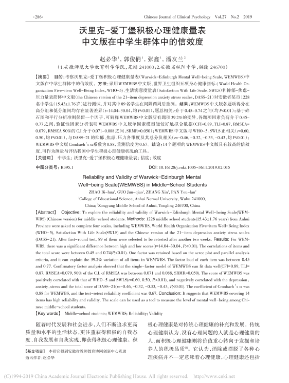 赵必华等:沃里克—爱丁堡积极心理健康量表中文版在中员工群体中的信效度