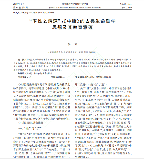 李卯:率性之谓道_中庸_的古典生命哲学思想及其教育意蕴