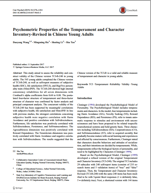 王道阳:Psychometric Properties of the Temperament and Character Inventory-Revised in Chinese Young Adults