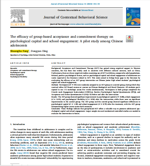 方双虎:The efficacy of group-based acceptance and commitment therapy on psychological capital and school engagement: A pilot study among Chinese adolescents