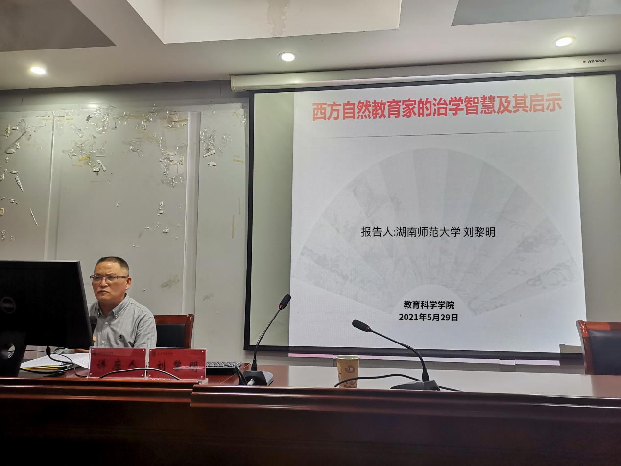 本网讯(教科院 文/张旭航 图/王薛晴)5月29日下午,湖南师范大学硕士生导师刘黎明副教授应邀来公司做题为《西方自然教育家的治学智慧及其启示》的学术讲座。本场讲座在公司三楼学术交流中心举行,由公司教育史硕士点负责人孙德玉教授主持,教育史、教育学原理等教育学相关专业的教师、博士和硕士生到场聆听和学习。