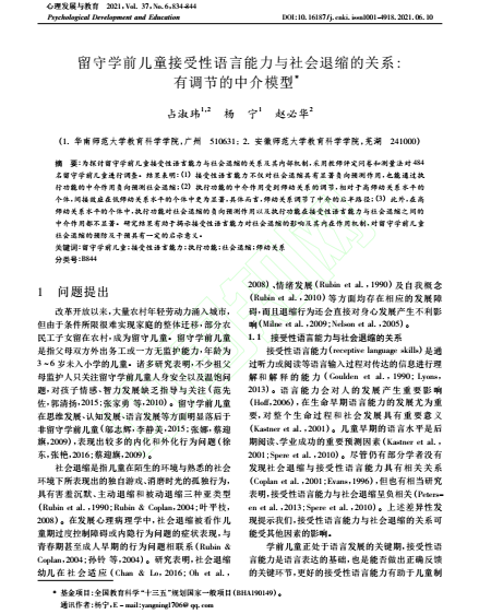 【教师科研】占淑玮、杨宁、赵必华:留守学前儿童接受性语言能力与社会退缩的关系:有调节的中介模型