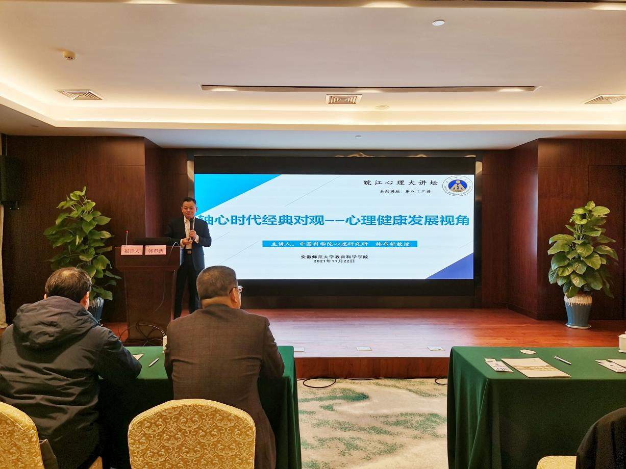 本网讯(教科院 文/桂先梅 图/王丽 江雨潜)11月22日上午,皖江心理大讲坛第八十三讲在铁山宾馆松苑二楼弋江厅如期举行,中国科公司心理研究所博士生导师、中国心理学会前任理事长韩布新研究员应邀作《轴心时代经典对观——心理健康发展视角》学术报告。讲座由公司心理语言学博士点负责人、心理学一级学科硕士点负责人、博士生导师葛明贵教授主持,心理学系桑青松教授、方双虎教授、宣宾教授等,以及心理学硕士研究生和心理健康教育专业硕士研究生等近70名师生到场聆听学习。