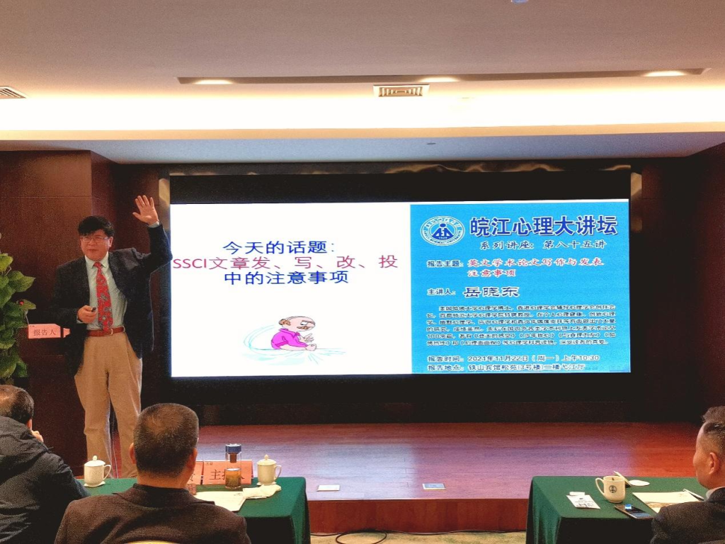 本网讯(教科院 文/王丽 图/桂先梅 江雨潜)11月22日上午,皖江心理大讲坛第八十五讲在铁山宾馆松苑二楼弋江厅精彩开讲。美国哈佛大学心理学博士、香港心理学会辅导心理学会创任会长、首都师范大学心理公司特聘教授岳晓东应邀作“英文学术论文写作与发表注意事项”的主题讲座。讲座由公司心理语言学博士点负责人、心理学一级学科硕士点负责人、博士生导师葛明贵教授主持,心理学系桑青松教授、方双虎教授、宣宾教授等,以及心理学和心理健康教育等研究生近70名师生到场聆听学习。
