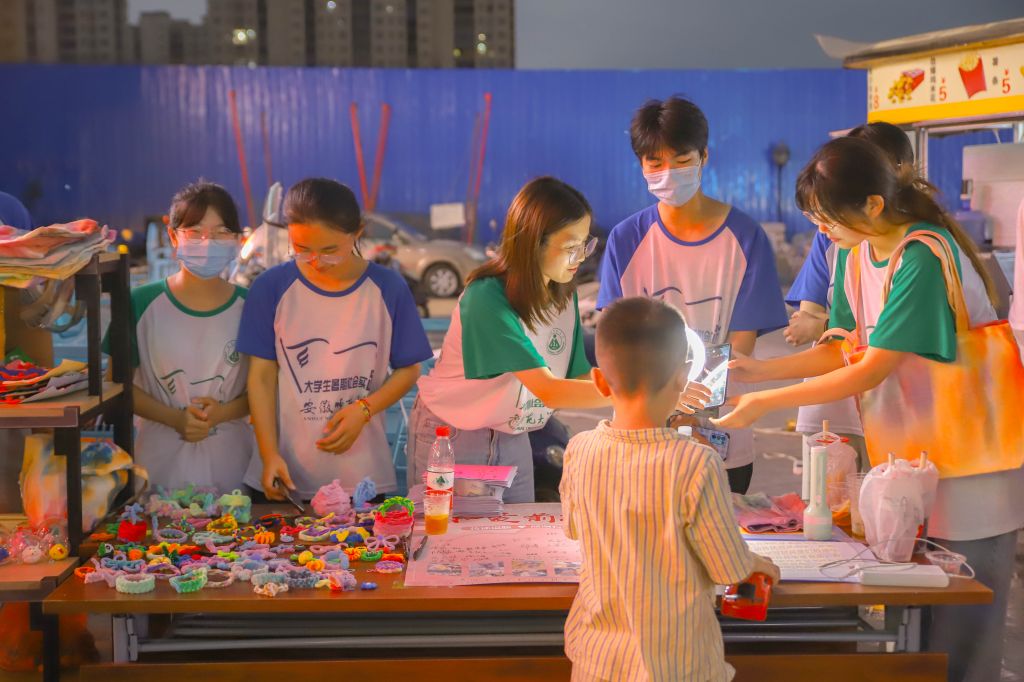 在活动过程中,爱心支教团队坚持以“教学-作品-义卖-捐赠”的循环模式。由队员们自费购买相关材料,设计“以黏绘景”黏土课、“以折塑性”折纸课、“以扭同心”扭扭棒课、“以染传情”扎染课等多种素质拓展课程,师生互动携手制作了大量手工作品,并将其转化为可售卖的商品。同时,爱心支教团队积极与当地政府联系以求达成合作关系。和县团县委、县商务局对本次义卖活动提供大力支持,协助团队打印纪念照片与宣传海报,并为团队确定了活动地点。