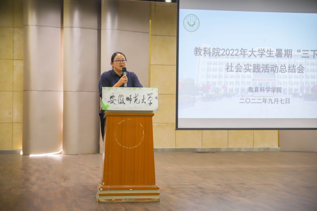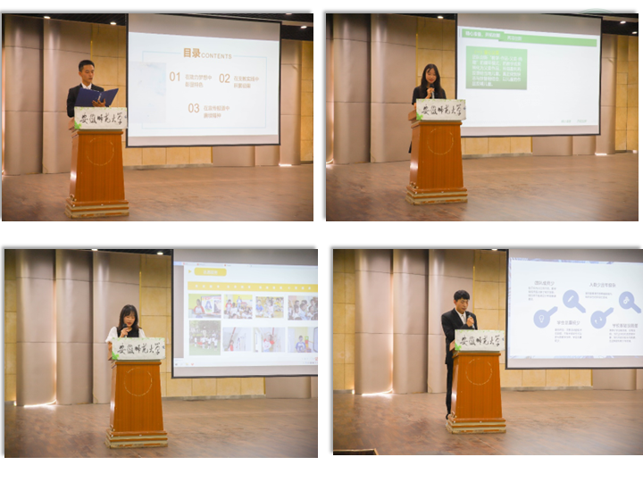 各实践团队代表围绕主要成果、宣传手段、先进典型事迹以及创新做法等内容进行汇报。在此次暑期社会实践过程中,教科学子从推进课业辅导、护航心理健康、开展生涯访谈、提升科学素养、传承红色基因、铭记少年责任、关注特殊儿童等方面着手设计了多种活动,在实践中增长经验才干,从行动中厚植理想情怀,收获社会广泛好评。全心全益赴马鞍山和县“爱心支教·教育调研”团队代表李杰熙在汇报中对团队的“教学-作品-义卖-捐赠”的循环模式与“喜迎二十大”主题系列活动进行介绍,总结团队在实践过程中取得的成果并展望了与和县的十年之约。全心全益赴芜湖市弋江区推广青少年阅读本科生实践团队队长李佳欣从志愿服务、外部支持、宣传报道、调研成果四个方面展开汇报,她提出团队坚守呵护童心、共筑未来的初心,将一直奔走在志愿服务的道路上。