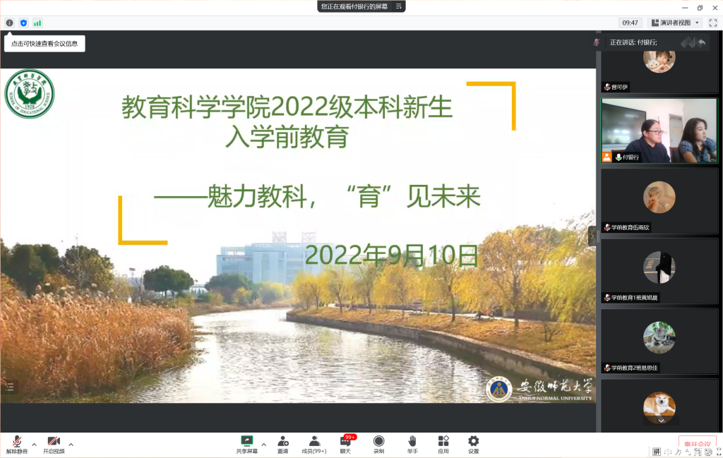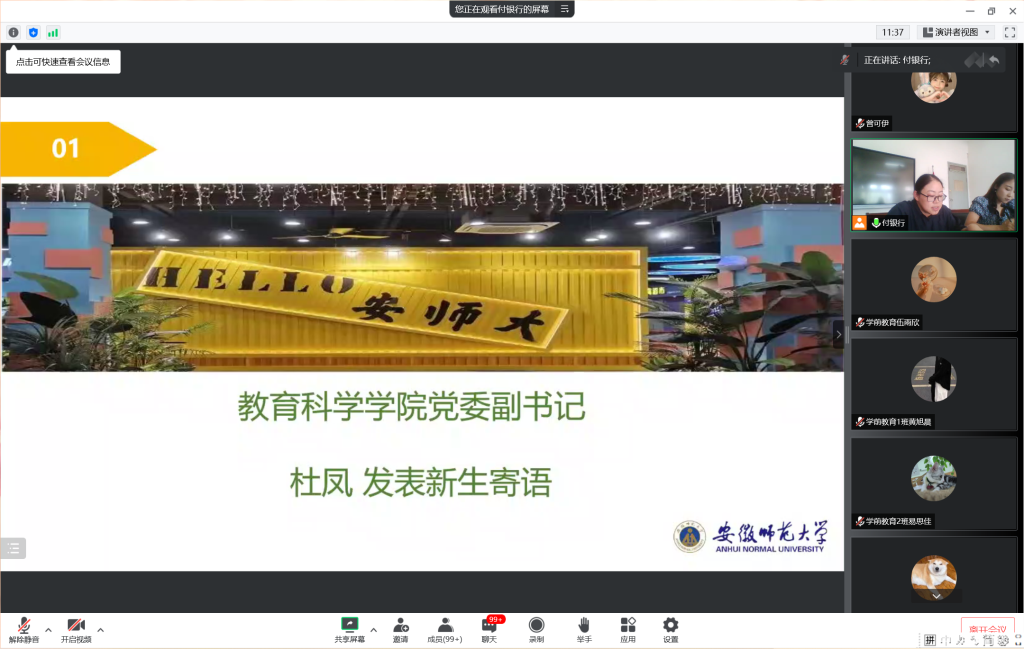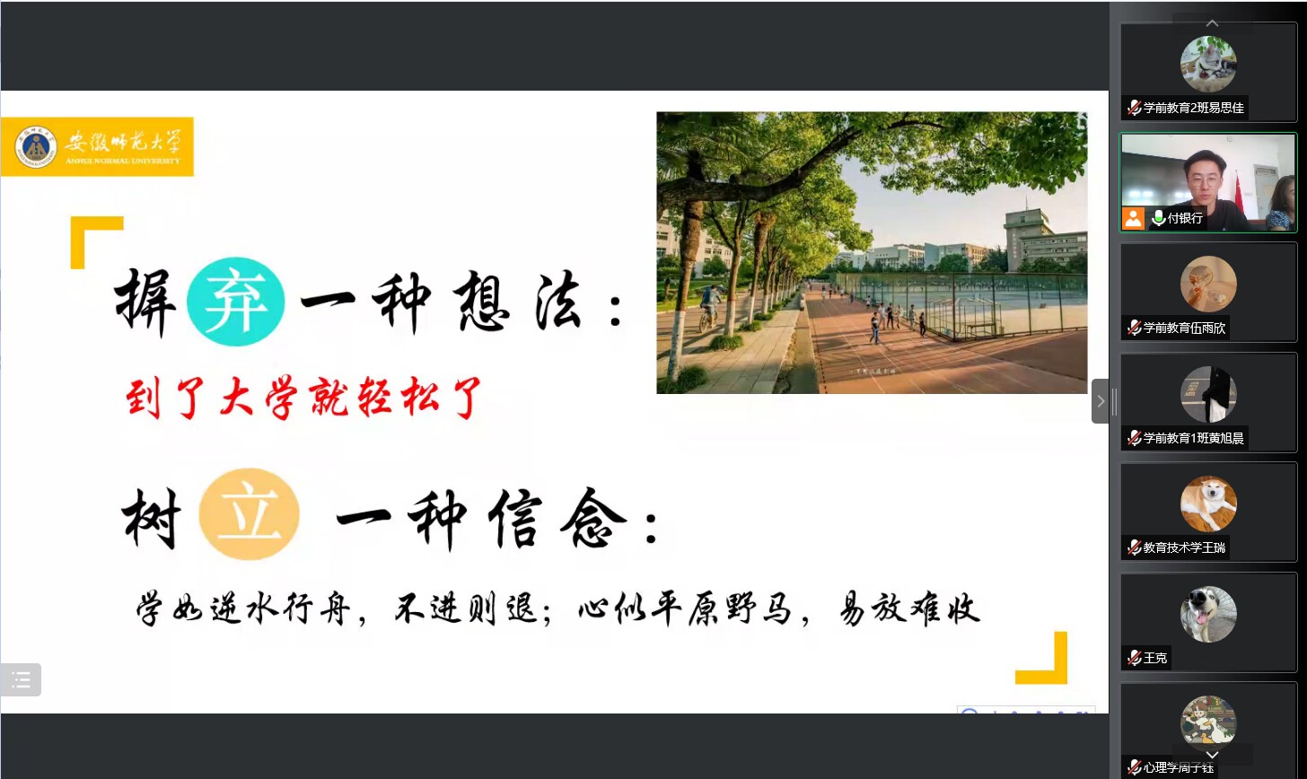 两位新生辅导员围绕“导员介绍”“你好,安师大”两个部分进行了具体阐述。程雅楠介绍了辅导员的具体职责,付银行从“大学是什么?”“大学有什么?”等问题出发向同学们介绍了老员工活。付银行和程雅楠着重阐述了新生报到须知和疫情防护要求,助力新生安全来校。