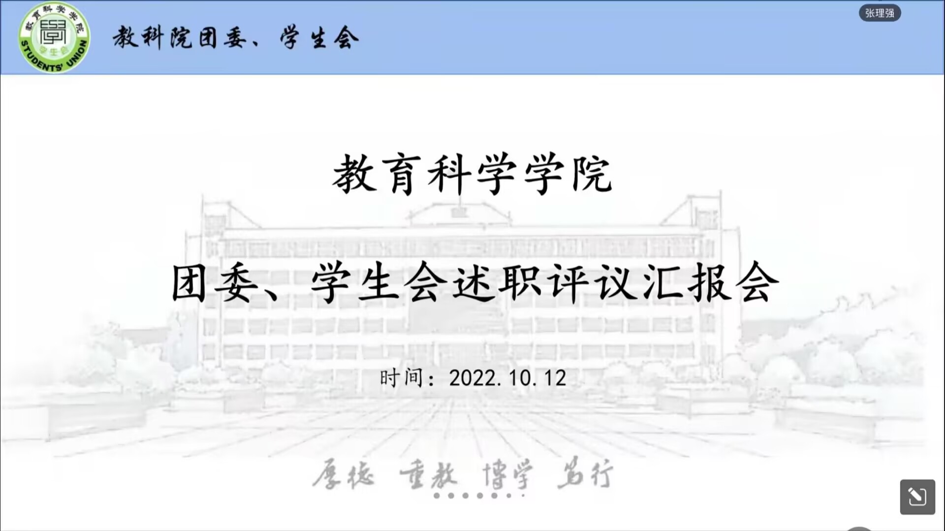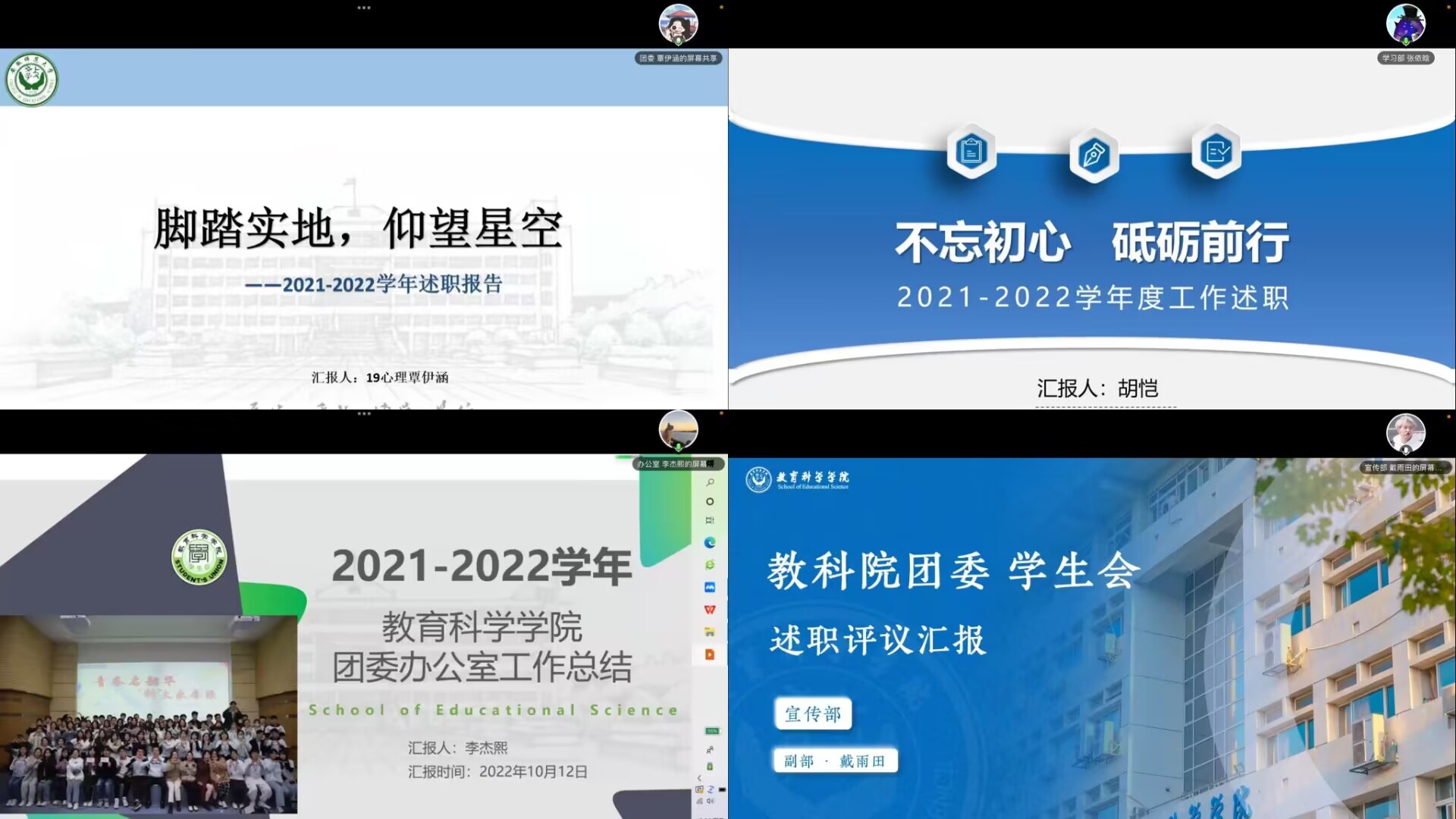 不忘初心共努力,砥砺奋进谋新篇。本次汇报会旨在对上一学年教科院团委、员工会的工作成果与经验进行总结与交流,是增强院团委、员工会组织建设,加强团学工作整体性和有效性的重要渠道。院团委、员工会将以更加饱满昂扬的姿态迎接新的学年,用更具朝气的精神风貌、更加优异的工作成绩迎接党的二十大胜利召开。
